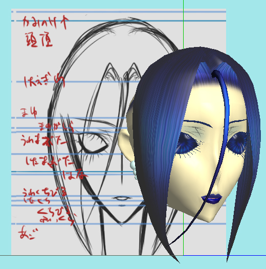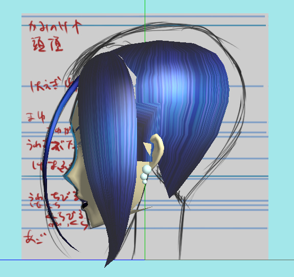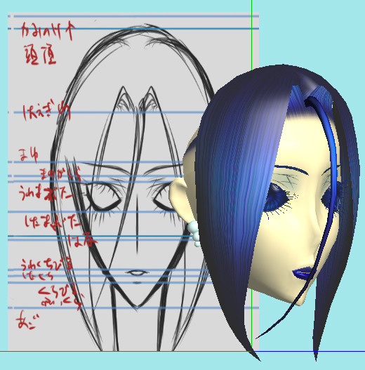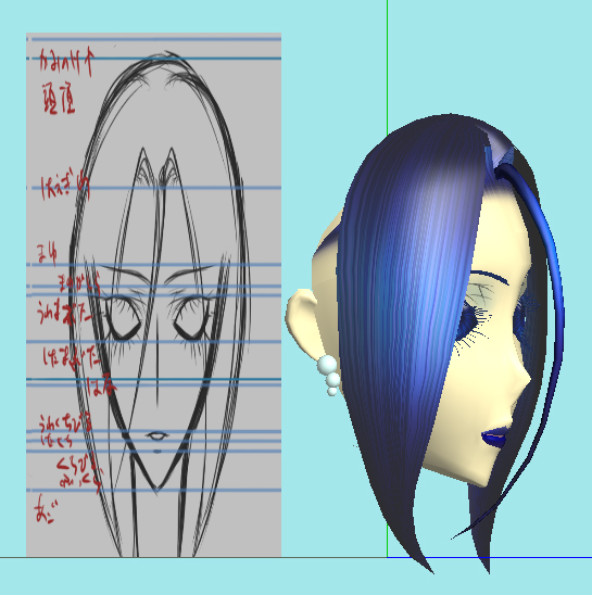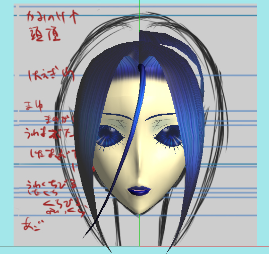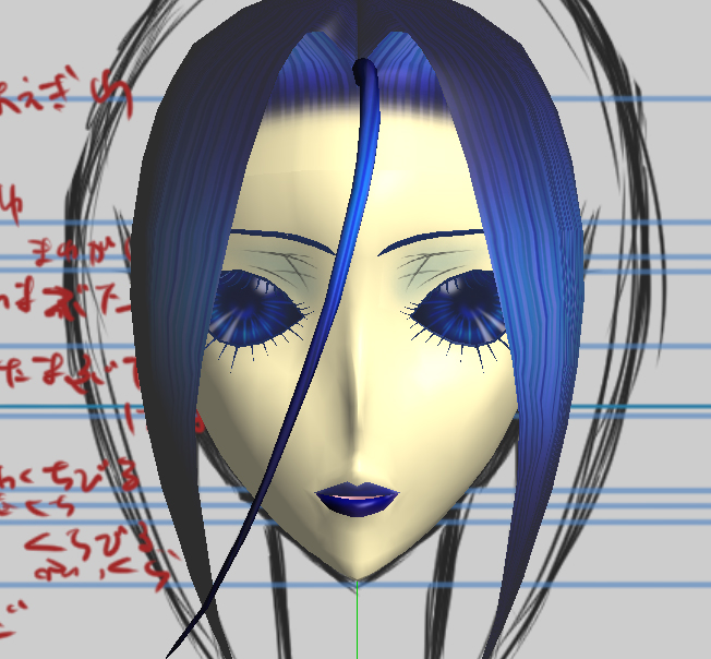 下絵と随分ボリュームが違いますが、下絵に合わせたら毛量がえらいことに&なんかすごく不自然になったので、前髪作成もイチからやり直したり……で、3D表示の違和感解消を優先したらこの毛量まで減らすことに。